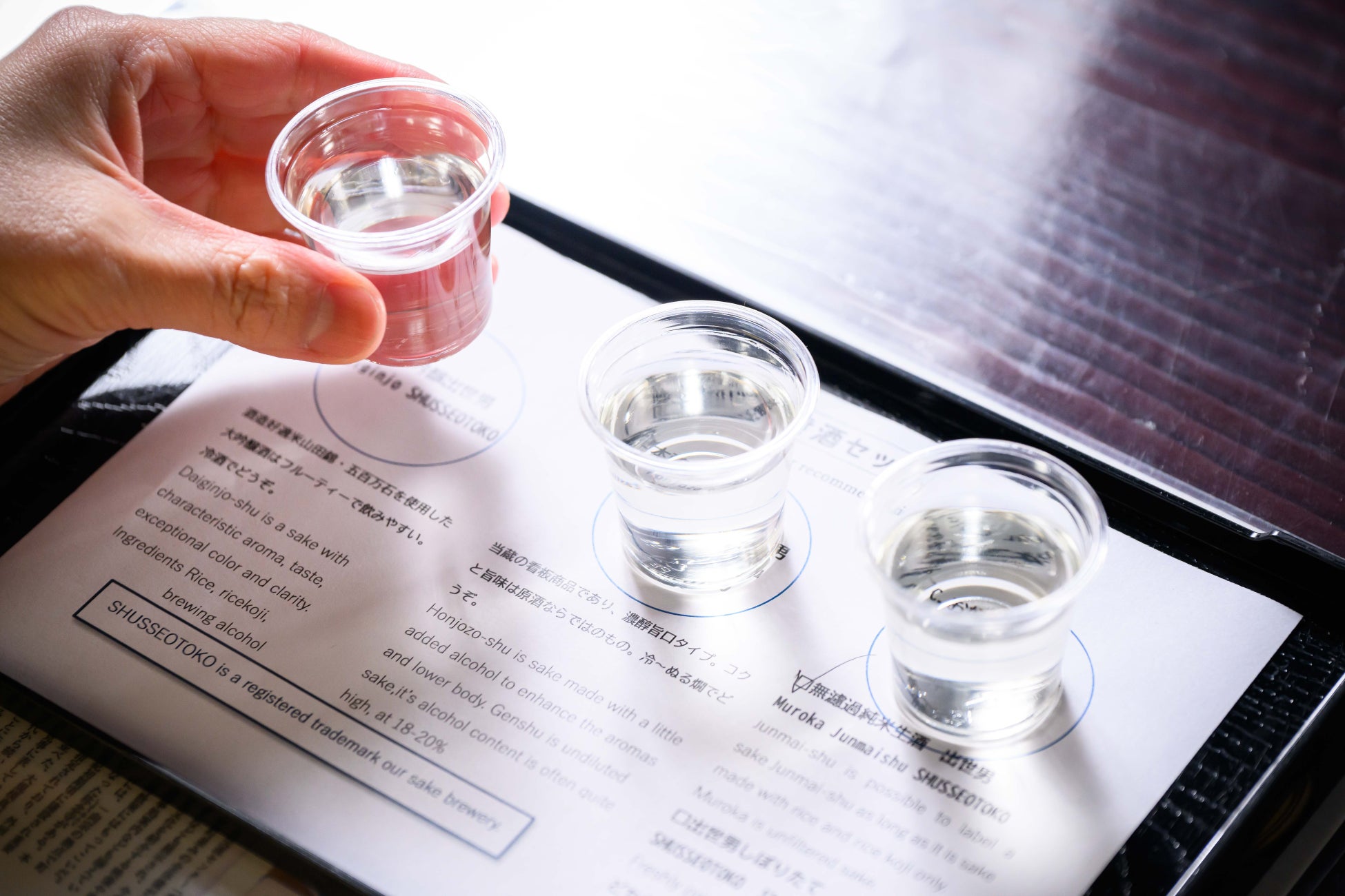 西川さんの想いや歴史にふれたのち、プログラムの最後には3種のお酒を試飲できます。3種はその日のおすすめを西川さんが選んで提供します。例えば、代表銘柄である「出世男」はやや辛口で旨味のある酒質が食中酒としても人気があります。縁起の良い名と喜ばれることも多く、日々の暮らしに寄り添う酒でありたいという想いが反映されています。また、当プログラムに参加の思い出として、おちょこまたは升をプレゼントします。
