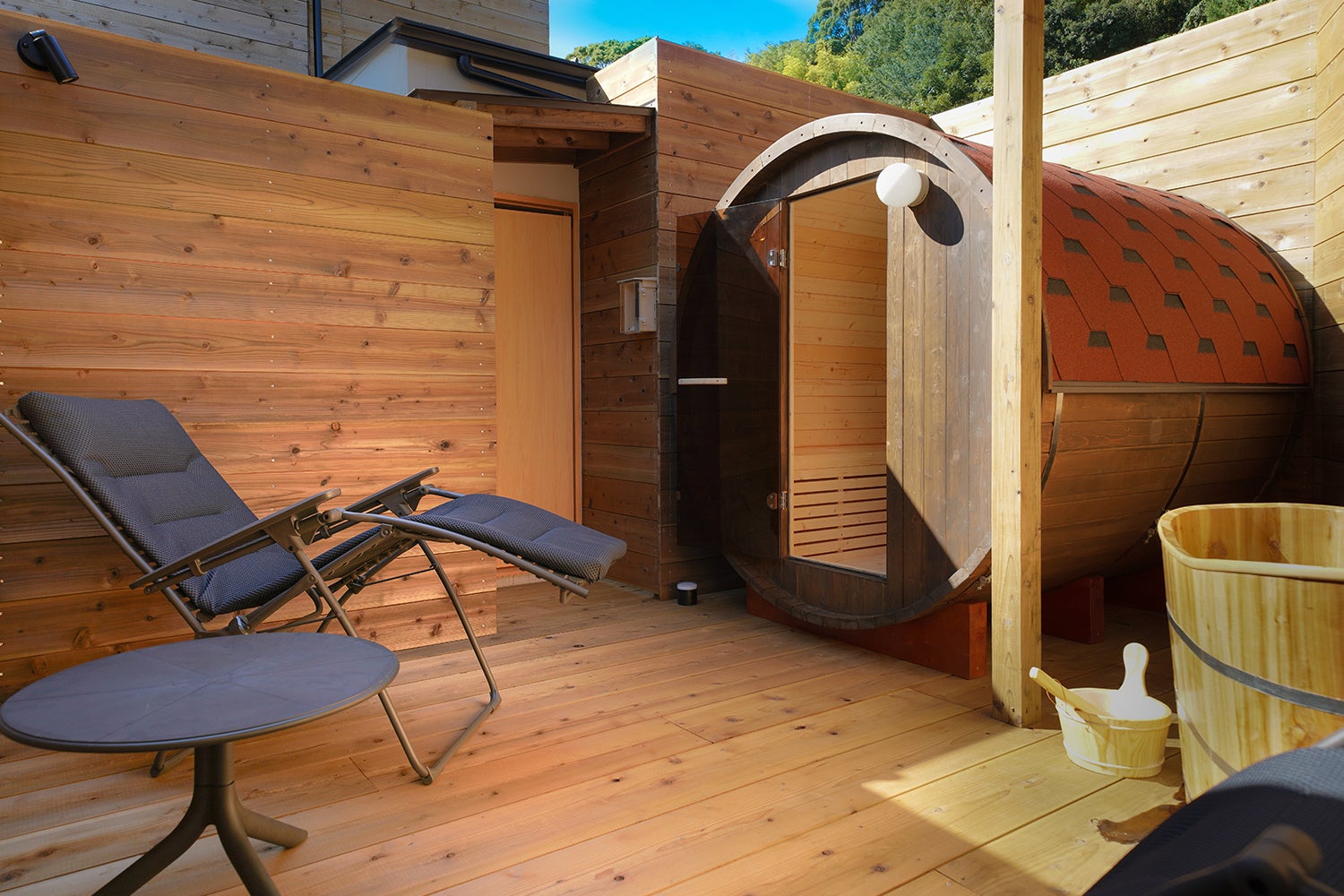 2022年には「温泉もサウナも楽しみたい」というご要望にお応えして“プライベートサウナ”をご用意しました。専用のバレルサウナ・水風呂・外気浴スペースを備えており、誰にも邪魔されず自分だけの“ととのう空間”をご満喫いただけます。歴史ある温泉街・湯河原の豊かな自然の中で楽しむととのう体験は多くのサウナ―にご好評を頂いております。