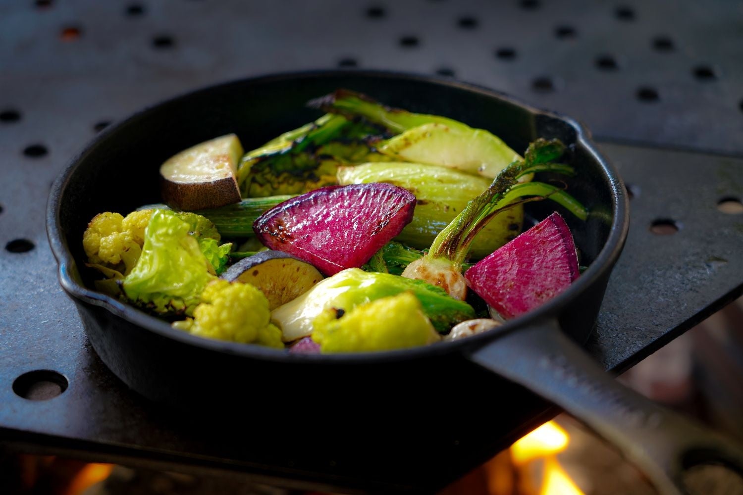 多くのグランピング施設で一般的なBBQガスグリルではなく客室専用の焚き火台を設置して直火で仕上げるTHE BASE GLAMPING YUGAWARAのグランピングBBQメニュー。