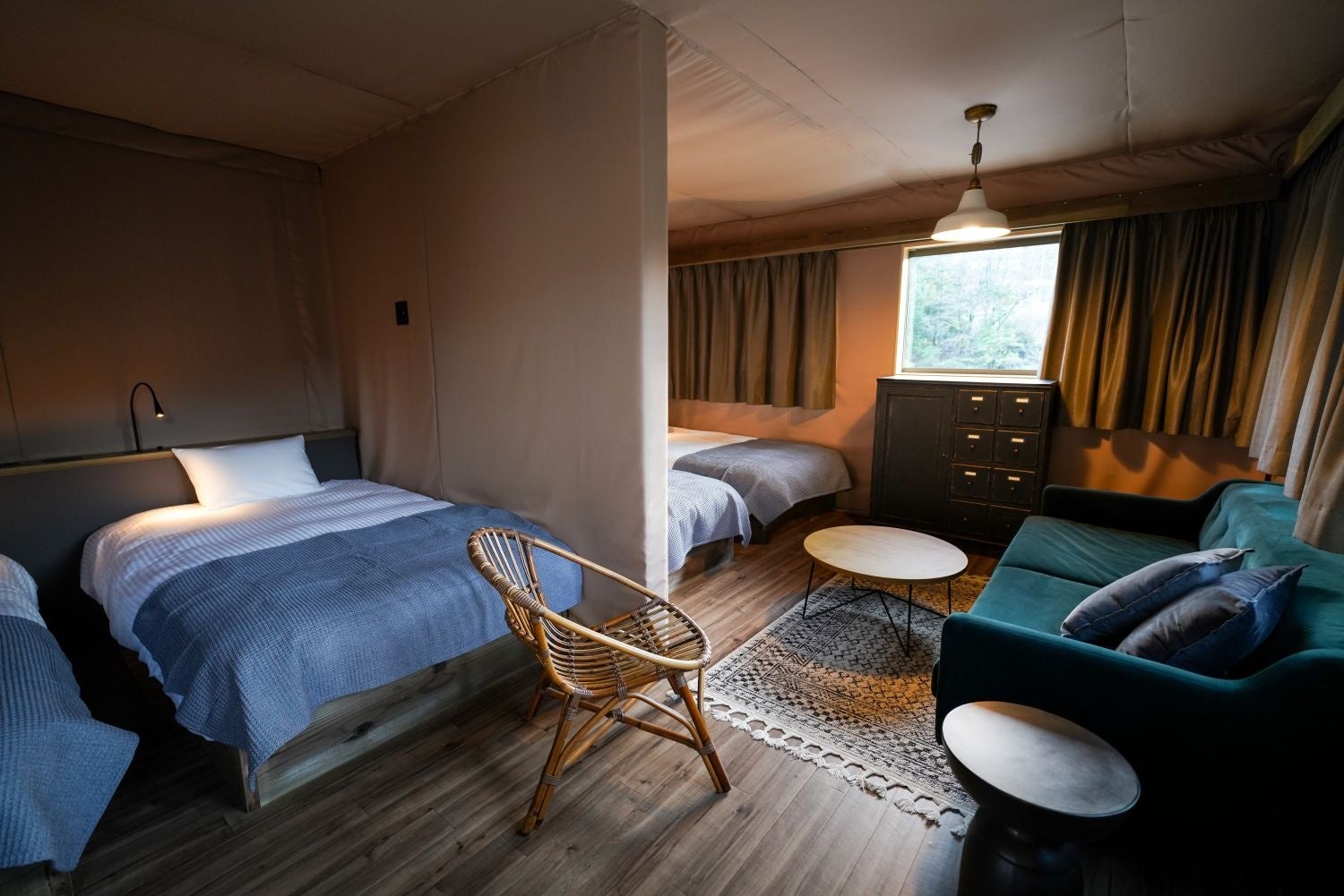 施設内のダイニング焚き火スペースでは、地元産の食材を活かした料理を提供。自然との調和を重視した空間で、日常を忘れる癒しのひとときをお過ごしいただけます。 さらに、一部の客室は愛犬と一緒に過ごせる仕様となっており、ペットも大切な家族の一員として旅を楽しむことができます。