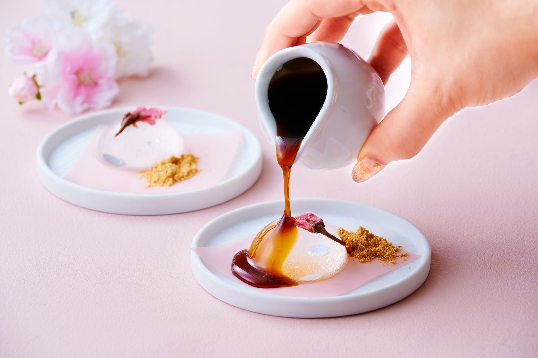 若葉が芽吹き始める表参道のケヤキ並木を臨むテラス席や、ハイエンドなインテリアが並ぶラグジュアリーな空間で、目でも舌でも桜をお楽しみください。