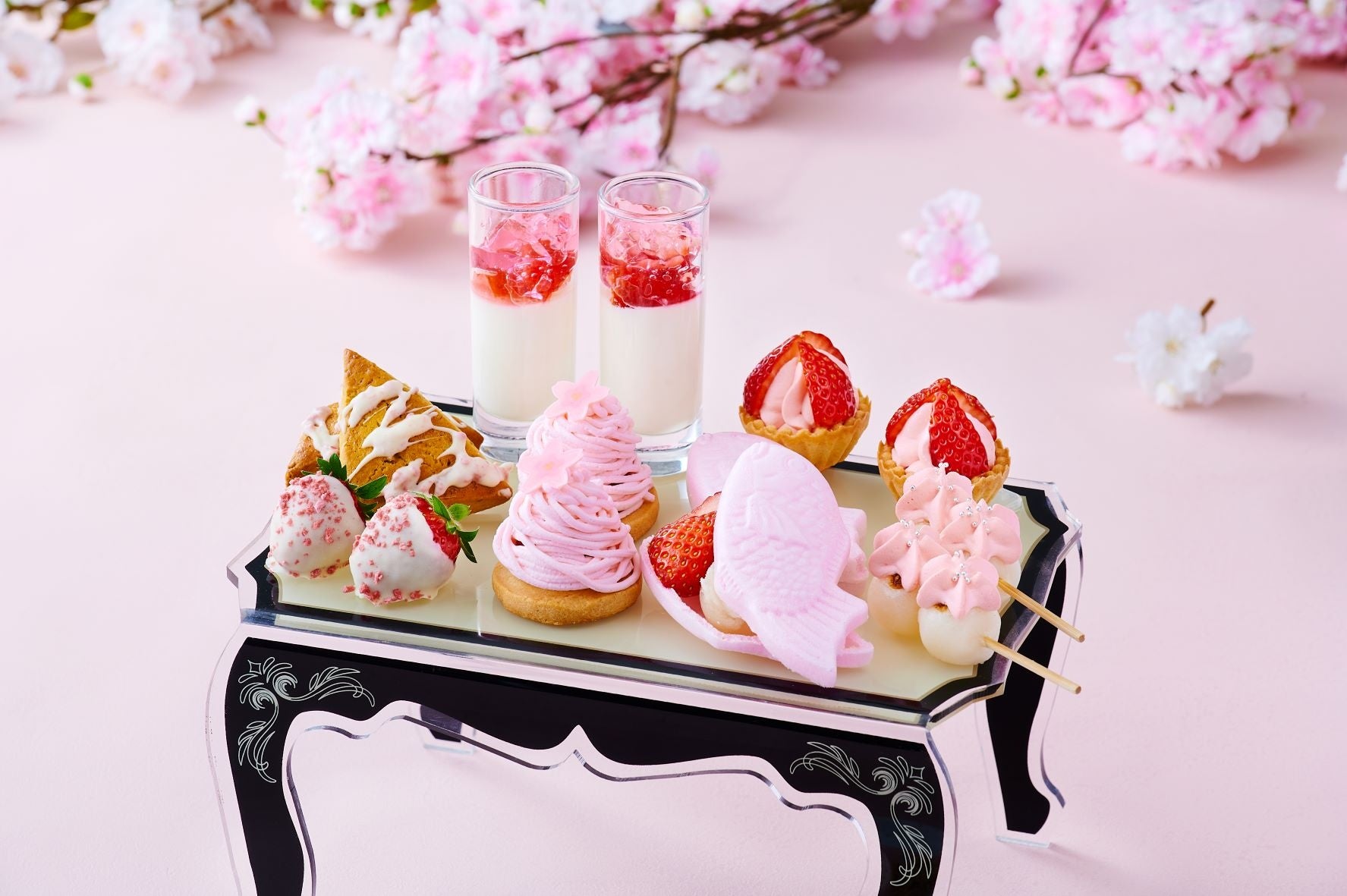苺を忍ばせた桜モンブランや、桜のフレークをあしらったなどチョコレートディップなど、心華やぐスイーツの数々が並びます。