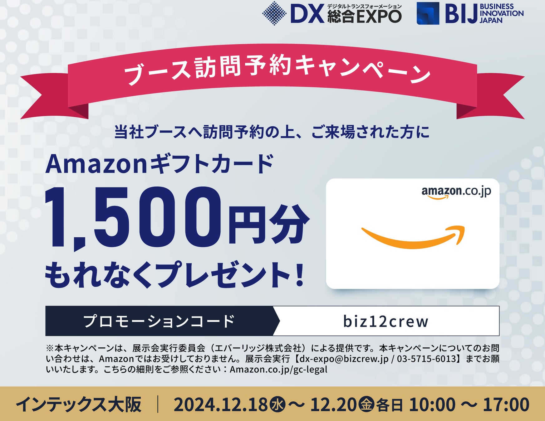 下記「無料お申し込みはこちら」より弊社ブースキャンペーンコード「biz12crew」をご記入の上、アイスマイリーブースの訪問予約をしていただきますと、別途事務局より「Amazonギフト券 1500円分」をプレゼントします!
