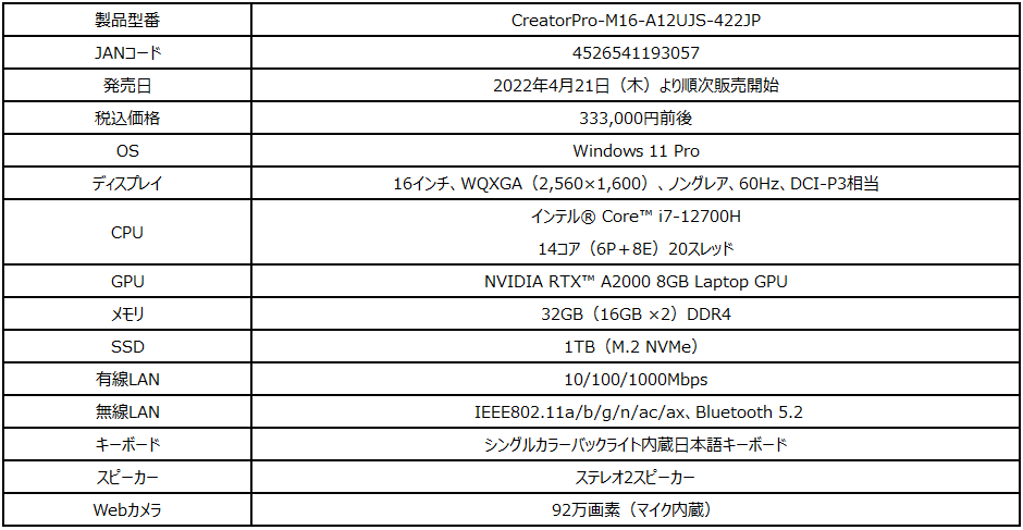 プロフェッショナル向け「NVIDIA RTX™ Laptop GPU」最新モデル搭載 モバイルワークステーション「CreatorPro M16 A12U」発売