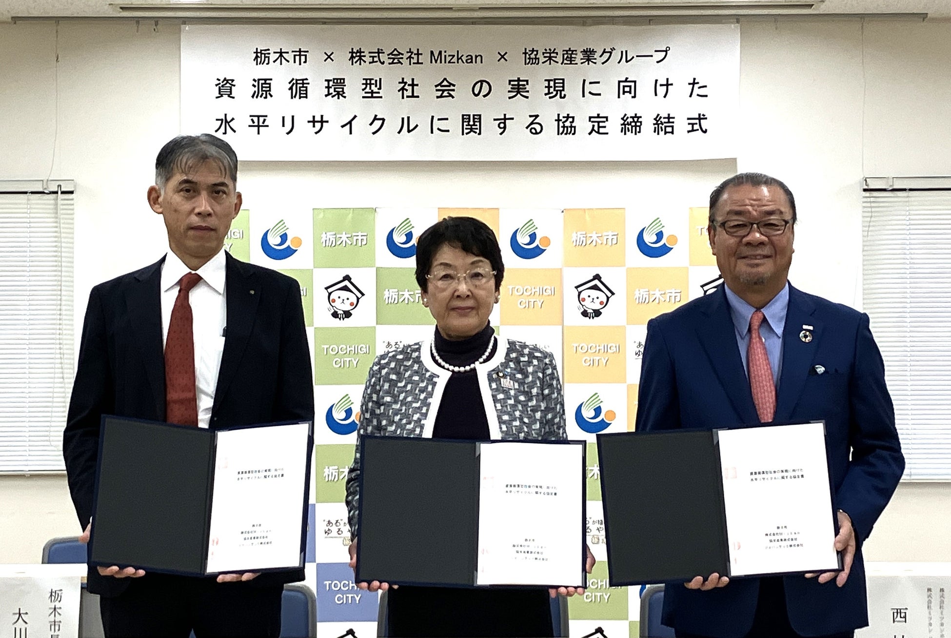 栃木県栃木市(市長:大川 秀子、以下栃木市)、株式会社Mizkan(本社:愛知県半田市、代表取締役社長兼CEO:吉永 智征、以下ミツカン)、協栄産業株式会社(本社:栃木県小山市、代表取締役:古澤 栄一、以下協栄産業)、ジャパンテック株式会社(栃木県鹿沼市、代表取締役:古澤 栄一、以下ジャパンテック)は、2024年10月31日(木)に、「資源循環型社会の実現に向けたペットボトルの水平リサイクルに関する協定書」(以下、本協定)を締結いたしました。本協定により、栃木市において排出・回収される使用済みペットボトルを「ボトルtoボトル 水平リサイクル」により繰り返しペットボトルに生まれ変わらせることで、栃木市における資源循環型社会の実現に役立てることに「ともに」取り組んでまいります。