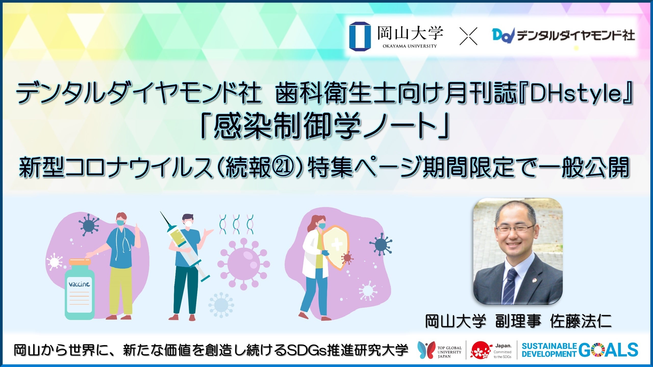 国立大学法人岡山大学(本部:岡山市北区、学長:槇野博史)東京オフィス駐在の佐藤法仁副理事(研究・産学共創担当)・URAは、歯科総合出版社である株式会社デンタルダイヤモンド社(本社:東京都文京区本郷、代表取締役:濵野優)が歯科衛生士向けに発行している月刊誌『DHstyle』に、連載「感染制御学ノート」を2012(平成24)年1月から行っています。