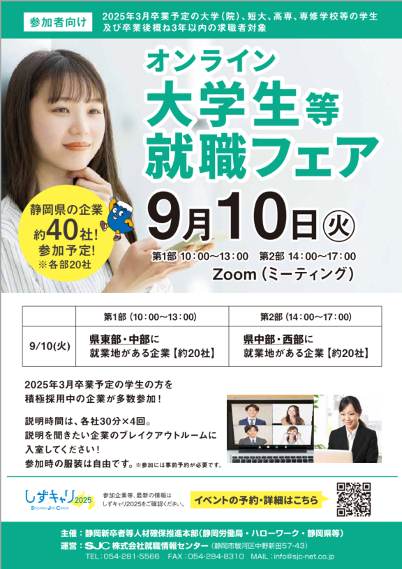 静岡新卒者等人材確保推進本部では、2025年3月卒業予定の大学生及び既卒3年以内の方を対象として、静岡県内に就業地のある企業との企業説明会をオンラインで開催します。