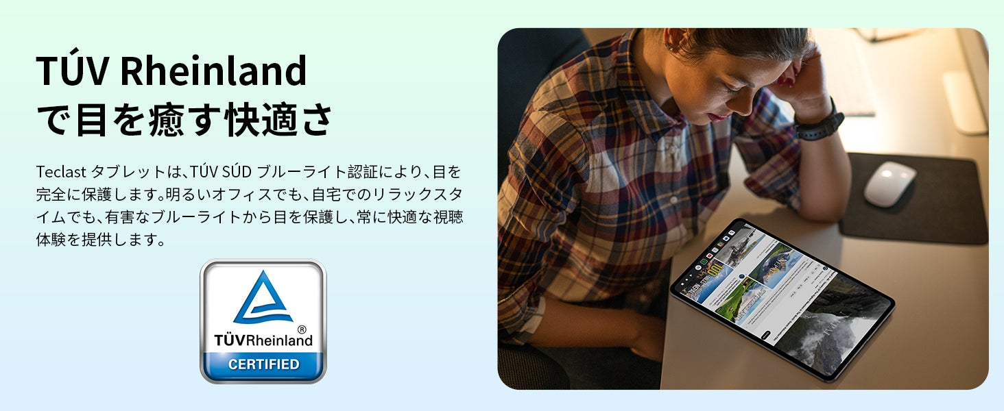 Teclastタブレットは、TÚV SÚDブルーライト認証により、目を完全に保護します。明るいオフィスでも、自宅でのリラックスタイムでも、有害なブルーライトから目を保護し、常に快適な視聴体験を提供します。