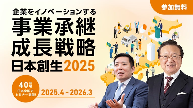 株式会社日本M&Aセンターホールディングス(以下、当社 / 本社:東京都千代田区 / 代表取締役社長:三宅 卓)の連結子会社である株式会社日本M&Aセンター(以下、日本M&Aセンター / 本社:東京都千代田区 / 代表取締役社長:竹内 直樹)は、後継者問題や企業成長といった中堅中小企業の経営課題の解決のため「企業をイノベーションする事業承継・成長戦略セミナー 日本創生2025」を2025年4月から全国40会場で開催することをお知らせいたします。