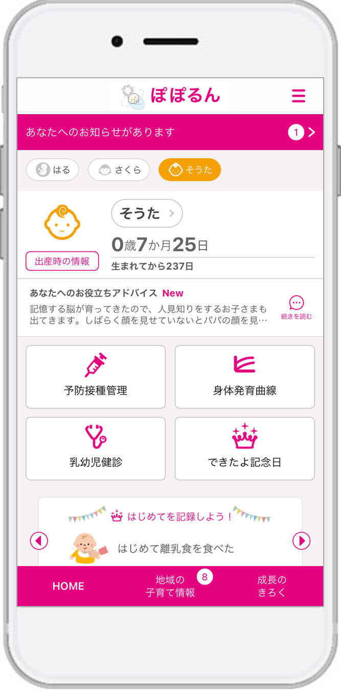 朝霞市に採用された『ぽぽるん』は、スマートフォン・タブレット端末・PCに対応したサービスで、妊産婦と子どもの健康データの記録・管理や予防接種のスケジュール管理、出産・育児に関するアドバイスの提供、離れた地域に住む祖父母など家族との共有機能や、市が配信する地域の情報をお知らせするなど、育児や仕事に忙しい母親や父親を助けてくれる便利な機能が充実しています。