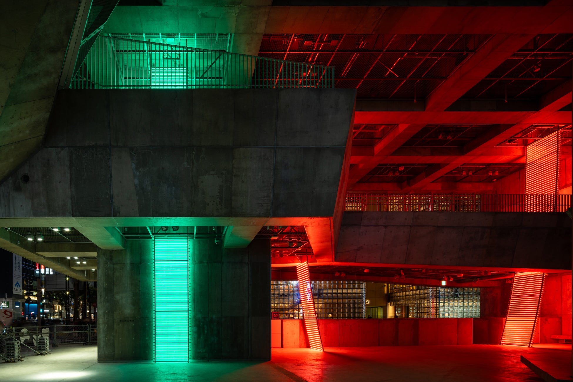 会場では、玉山拓郎が 工事中のGinza Sony Park の建物全体をひとつの空間としてとらえた作品を展示。地下2階から地上吹き抜けを大胆に使い、フロアの垣根を越えて建物を貫いた光のインスタレーション作品となりました。グリーンとオレンジのLED蛍光灯の光が街を行き交う国内外の人々の注目を集め、その光に誘われるようにGinza Sony Parkに立ち寄られる人も多く、内と外を隔てず街と一体化させることで、街を訪れる人々が気軽に行き交うことを目指したGinza Sony Parkのコンセプトを体感いただけました。