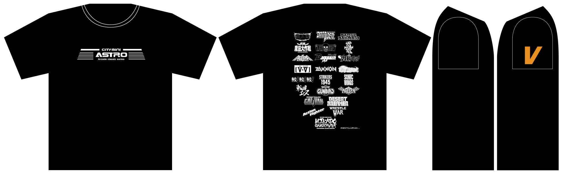 22作品の収録タイトルロゴが並んだ、まさに「シューティングスター集結!」ともいえるデザインTシャツです。胸部には、「アストロシティ」のロゴが入り、肩袖の部分には『アストロシティミニ V』の「V」マークが火山のように燃え滾るオレンジで表現しています。
