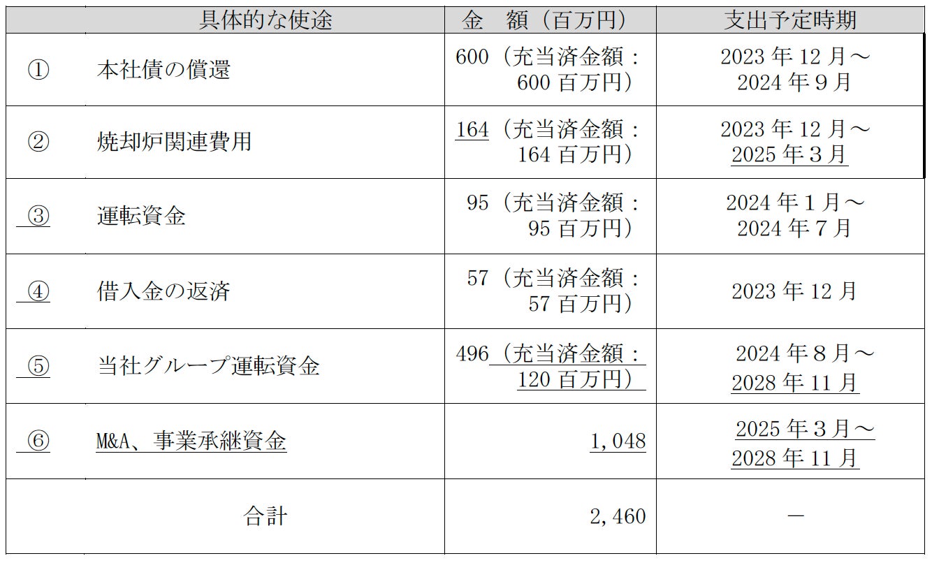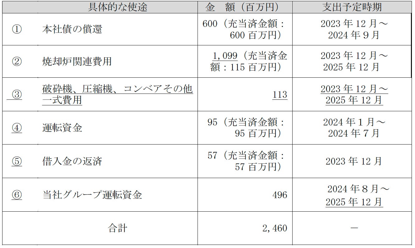 当社は、3月25日開催の取締役会において、当社子会社の宇部整環リサイクルセンター株式会社(以下、「宇部整環リサイクルセンター」といいます。)全株式の譲渡及び産業廃棄物処理事業の廃止、並びに2023年10月24日付で開示しました「第三者割当による第13回乃至第15回新株予約権及び無担保社債(私募債)の発行並びに新株予約権買取契約の締結に関するお知らせ」(以下、「当該お知らせ」といいます。)にてお知らせいたしました資金調達の使途(以下、「資金使途」といいます。)を、一部変更することを決議いたしましたので、下記のとおりお知らせいたします。