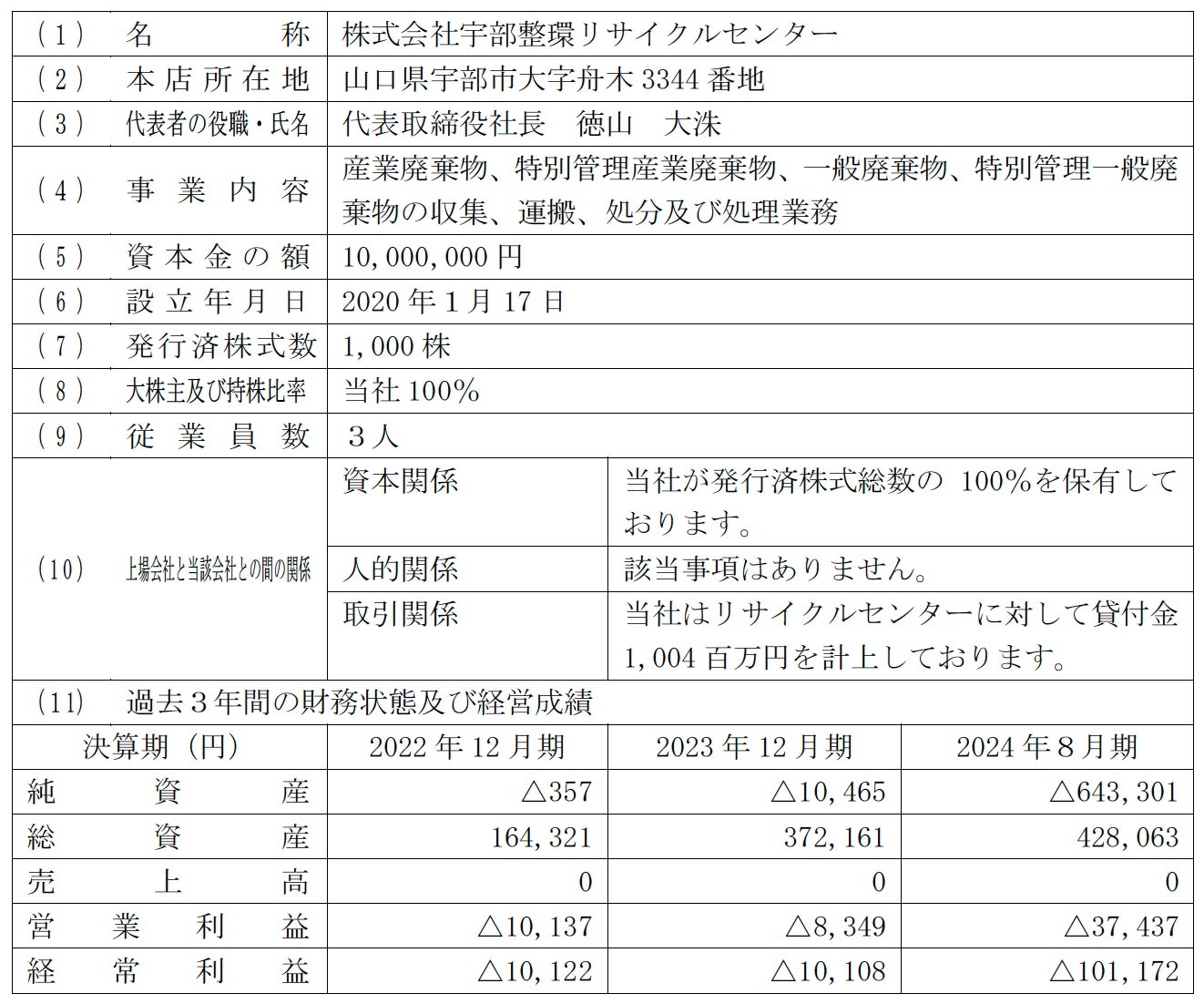 2.異動する子会社(宇部整環リサイクルセンター)及び廃止する事業の概要