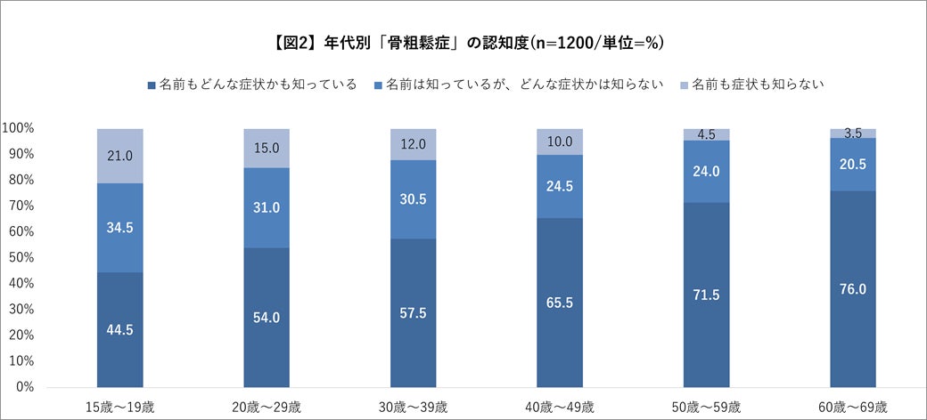 年代別に見ると、骨粗鬆症について「名前も症状も知っている」と回答した人は10代が44.5%、20代が54.0%であったのに対し、50代は71.5%、60代では76.0%と20~30ポイントほど差がみられた。【図2】
