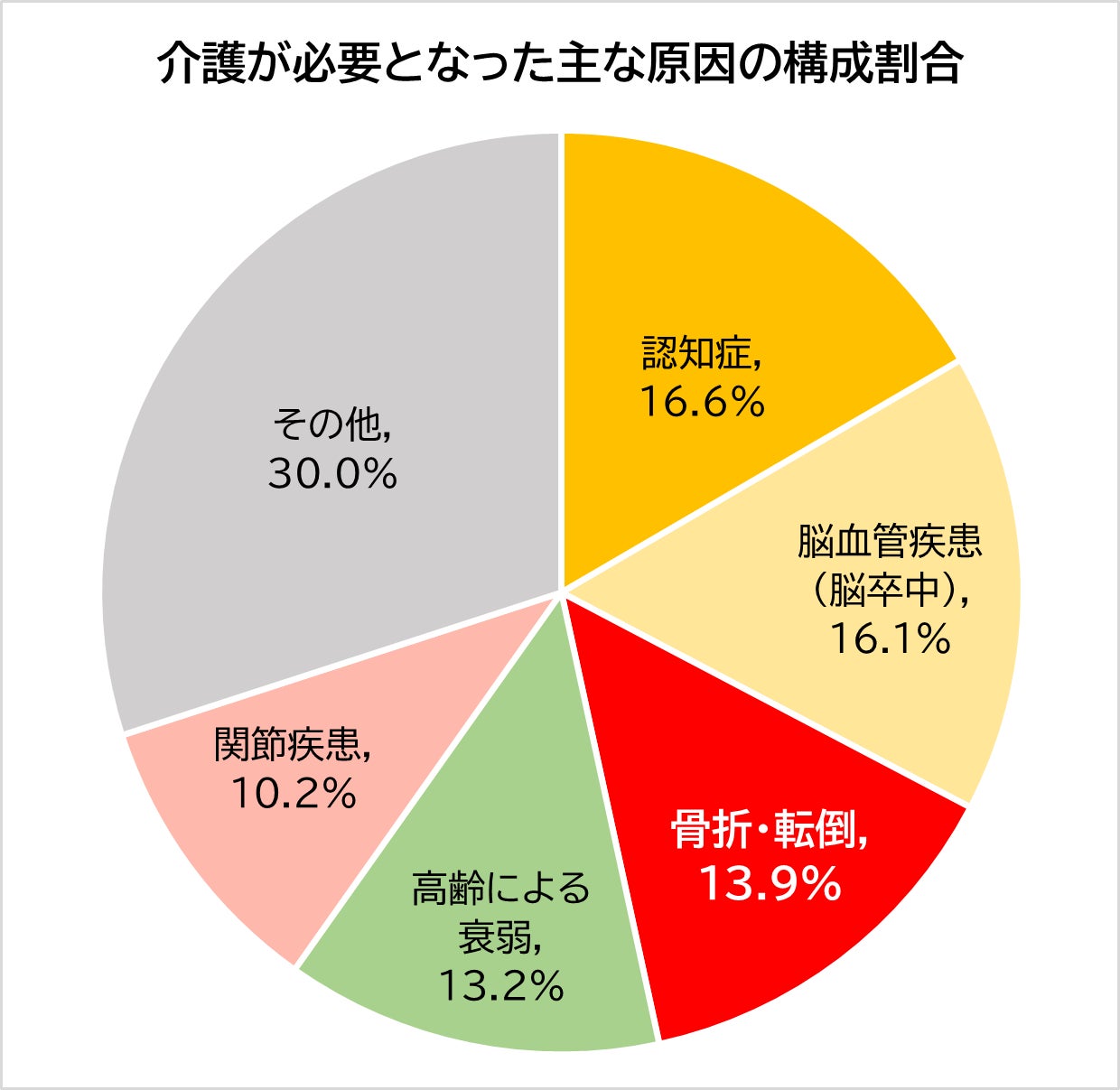 急速な高齢化によって、日本経済のみならず社会に深刻な影響を及ぼす2025年問題が間近に迫っており、健康寿命の延伸が喫緊の課題となっています。2022年国民生活基礎調査によると、日本では介護が必要になったきっかけとして「骨折・転倒」が13.9%と3番目に多くなっています(右図)*1。骨折は、移動・食事・入浴など日常生活を送るために最低限必要な動作(ADL)への影響が大きく、そのまま寝たきりになるリスクもあります。また、骨の量が減ることで強度が弱まる骨粗鬆症により、さらに骨が折れる可能性が高まり、1か所が骨折するとそれ以外の場所も連続して折れてしまう「ドミノ骨折」という症状も潜んでいます。