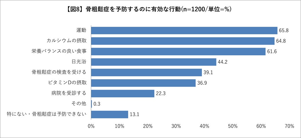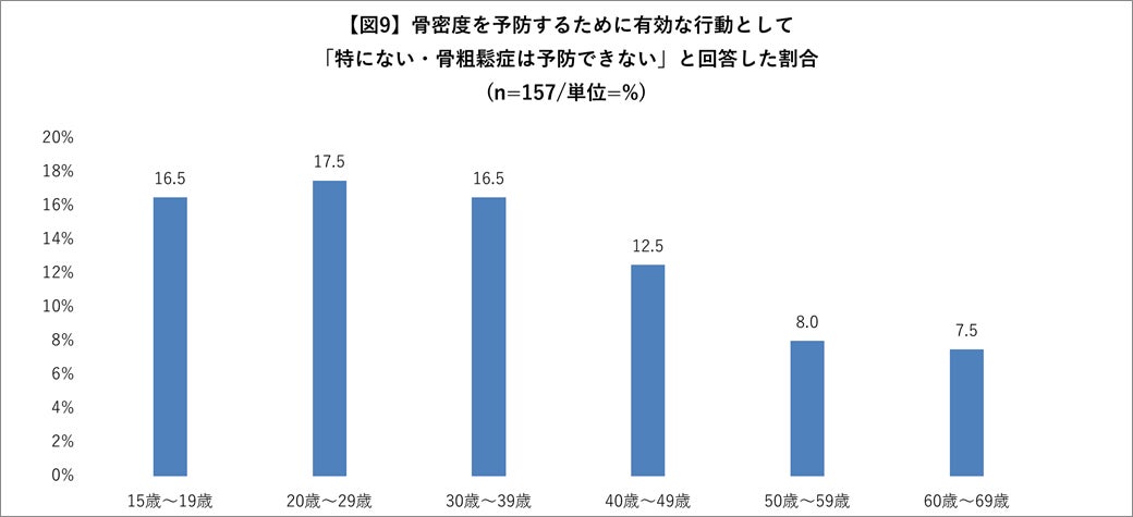 骨粗鬆症を予防するために有効な行動としては「運動(65.8%)」をはじめ日常生活に取り入れられるものが挙がる一方、「病院を受診する(22.3%)」や「骨粗鬆症の検査を受ける(39.1%)」など医療アクセスに関する行動への意識は低くなっている。また、「特にない・骨粗鬆症は予防できない」と回答した人は、10代で16.5%、20代で17.5%と2割に近い値であり、50代で8.0%、60代でも7.5%と1割に近い結果であった。【図8】【図9】