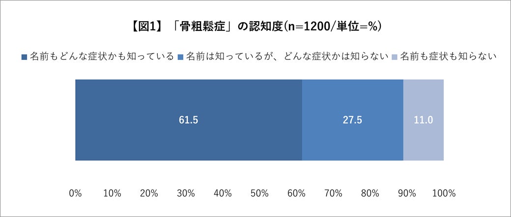 骨粗鬆症について「名前も症状も知っている」と回答した人が61.5%、「名前は知っているが、どんな症状かは知らない」と回答した人は27.5%となり、骨粗鬆症ついては一定程度認知されている。【図1】