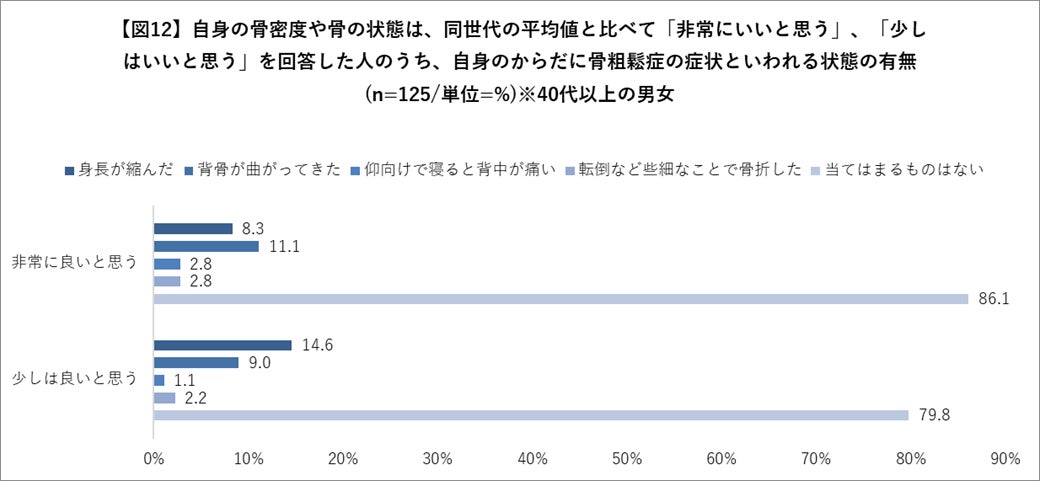 一方で、「非常にいいと思う」、「少しはいいと思う」と回答した40代以上の男女125名のなかで、骨粗鬆症の可能性がある症状(身長が縮んだ、背骨が曲がってきた、仰向けで寝ると背中が痛い、転倒など些細なことで骨折した)を感じている人は「非常にいいと思う」で13.9%、「少しはいいと思う」は20.2%であることが分かった。【図12】