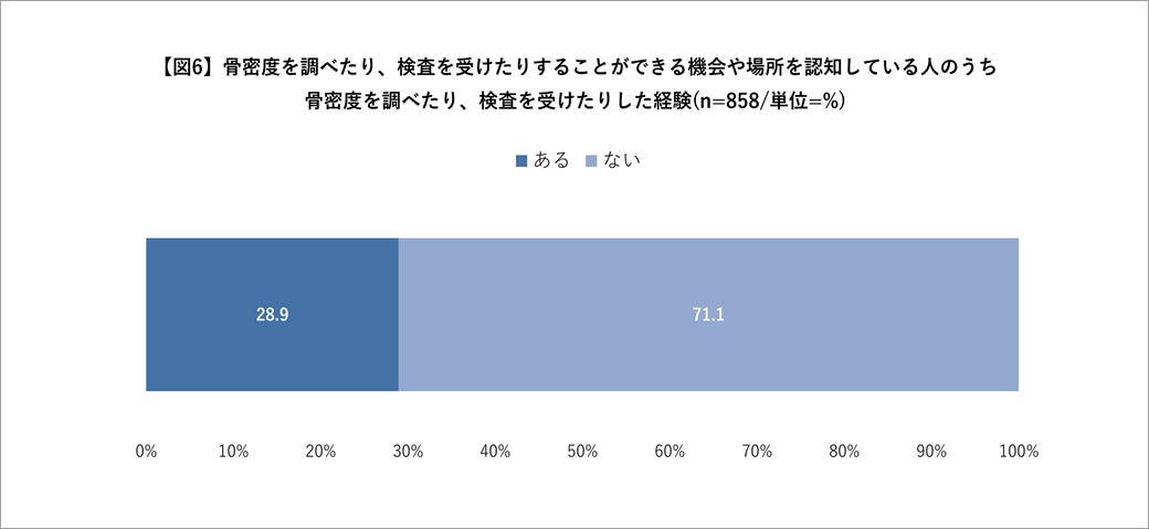 骨密度を調べたり、検査を受けたりすることができる機会や場所についていずれか知っていると回答(図5)した人のうち、実際に骨密度を調べたり、検査を受けたりしたことがある人は28.9%にとどまる。機会や場所を知っていたとしても病院に行くことのハードルの高さから受診につながっていないことが要因のひとつとして考えられる。【図6】
