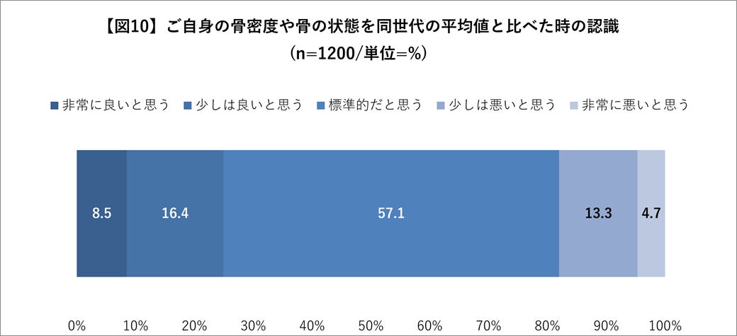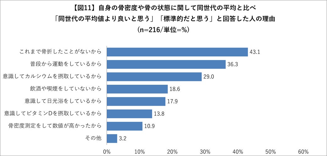 自身の骨密度や骨の状態に対する認識は、同世代の平均と比べ「非常にいいと思う」もしくは「少しはいいと思う」を回答した人はあわせて24.9%となり、その理由として、「これまで骨折したことが無い(43.1%)」、ついで「普段から運動をしているから(36.3%)」が挙げられた。【図10】【図11】