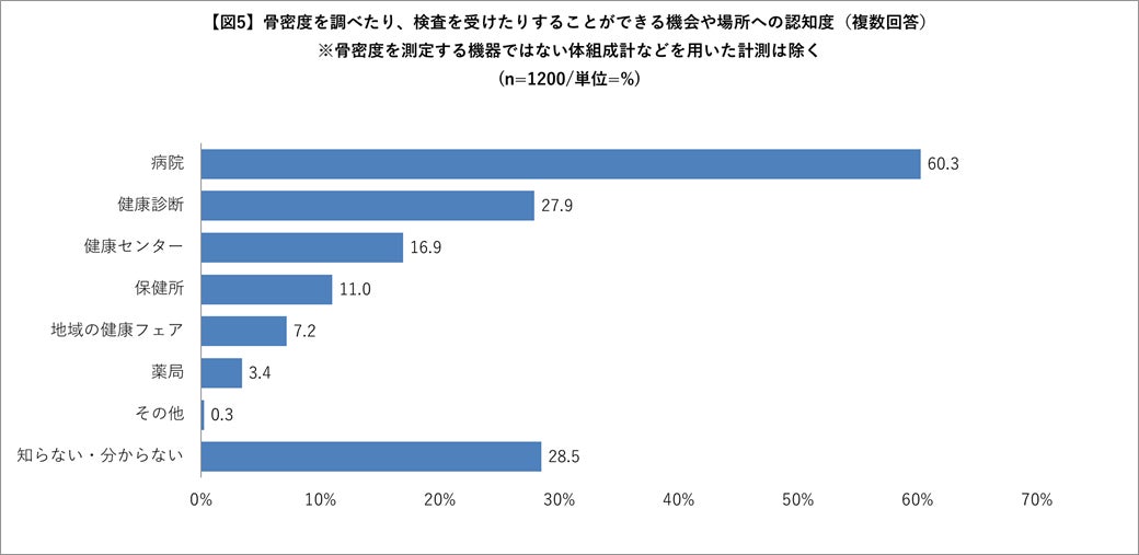 骨密度を調べたり、検査を受けたりすることができる機会や場所について知っているものを挙げる設問では「病院(60.3%)」と回答した人が最も多く、次点で「健康診断(27.9%)」、「健康センター(16.9%)」となった。なお、「知らない・分からない」と回答した人は28.5%と3人に1人にのぼる。【図5】