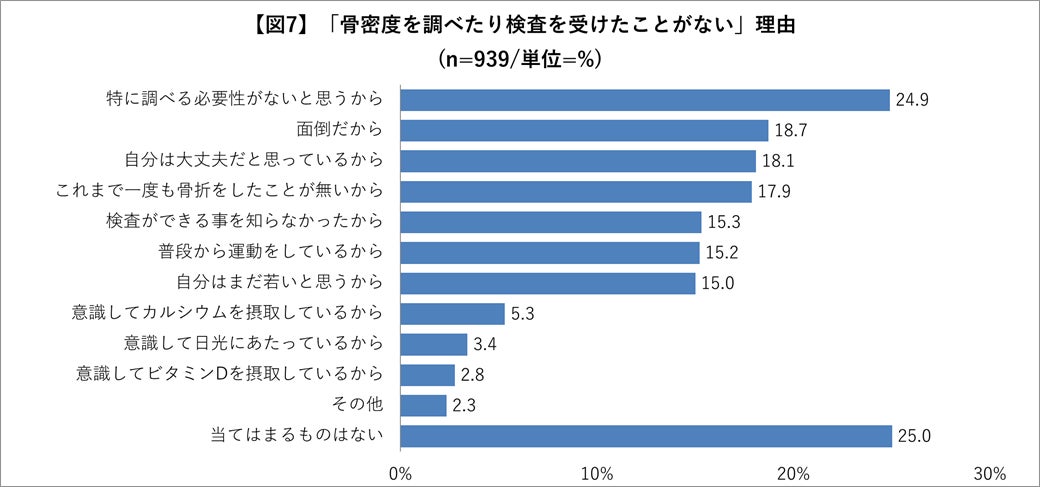 これまで骨密度を調べたり、検査を受けたりしたことがない理由として「特に調べる必要性がないと思うから(24.9%)」や「面倒だから(18.7%)」、「自分は大丈夫だと思っているから(18.1%)」といった自分の問題と認識していない回答が上位を占めている。【図7】