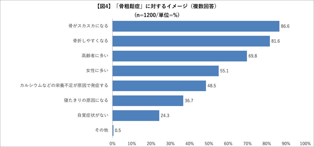 骨粗鬆症の疾患に対するイメージは「骨がスカスカになる(86.6%)」が最も多く、次いで「骨折しやすくなる(81.6%)」、「高齢者に多い(69.8%)」といった回答が続いた。【図4】