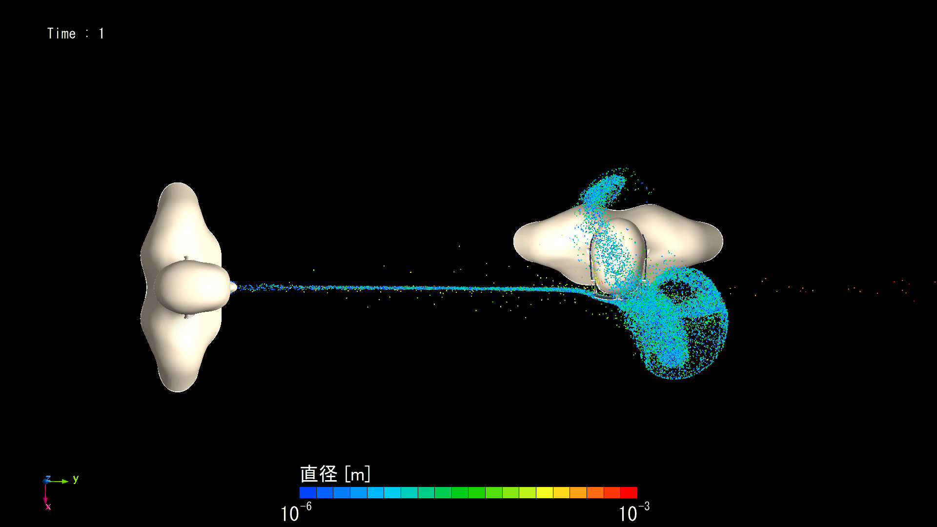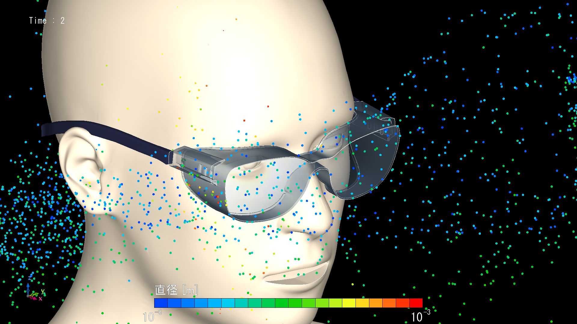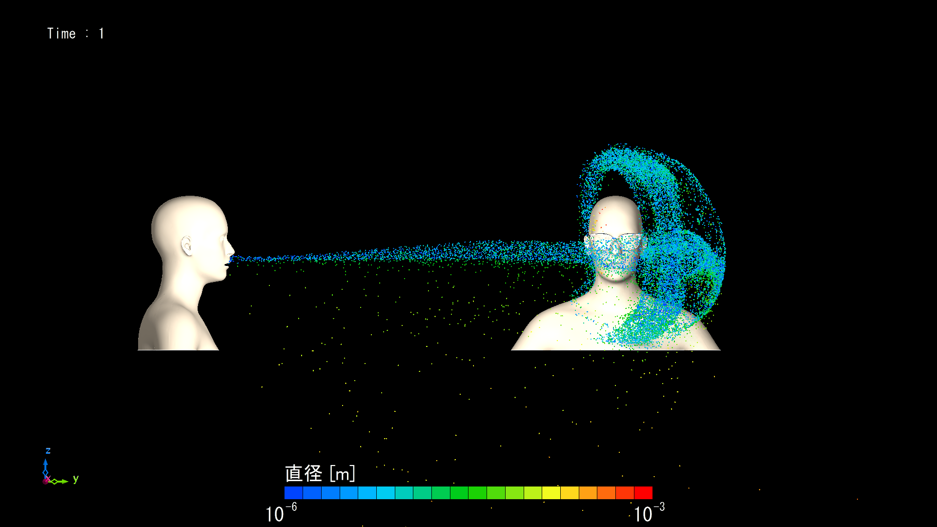 <飛沫シミュレーション概要>飛沫を仮想的に発生させ、発生直後(0~2秒後)に人頭模型の目の位置に飛んできた飛沫(粒径0.3um以上)の個数を検証