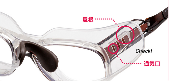 くもり止めレンズに結露がつくのを抑えるため(※)、飛沫や花粉が侵入しづらいフードの側面に通気口を設置。通気口の上にはルーフ(屋根)を新設することで、飛沫や花粉がますます侵入しにくくなりました。