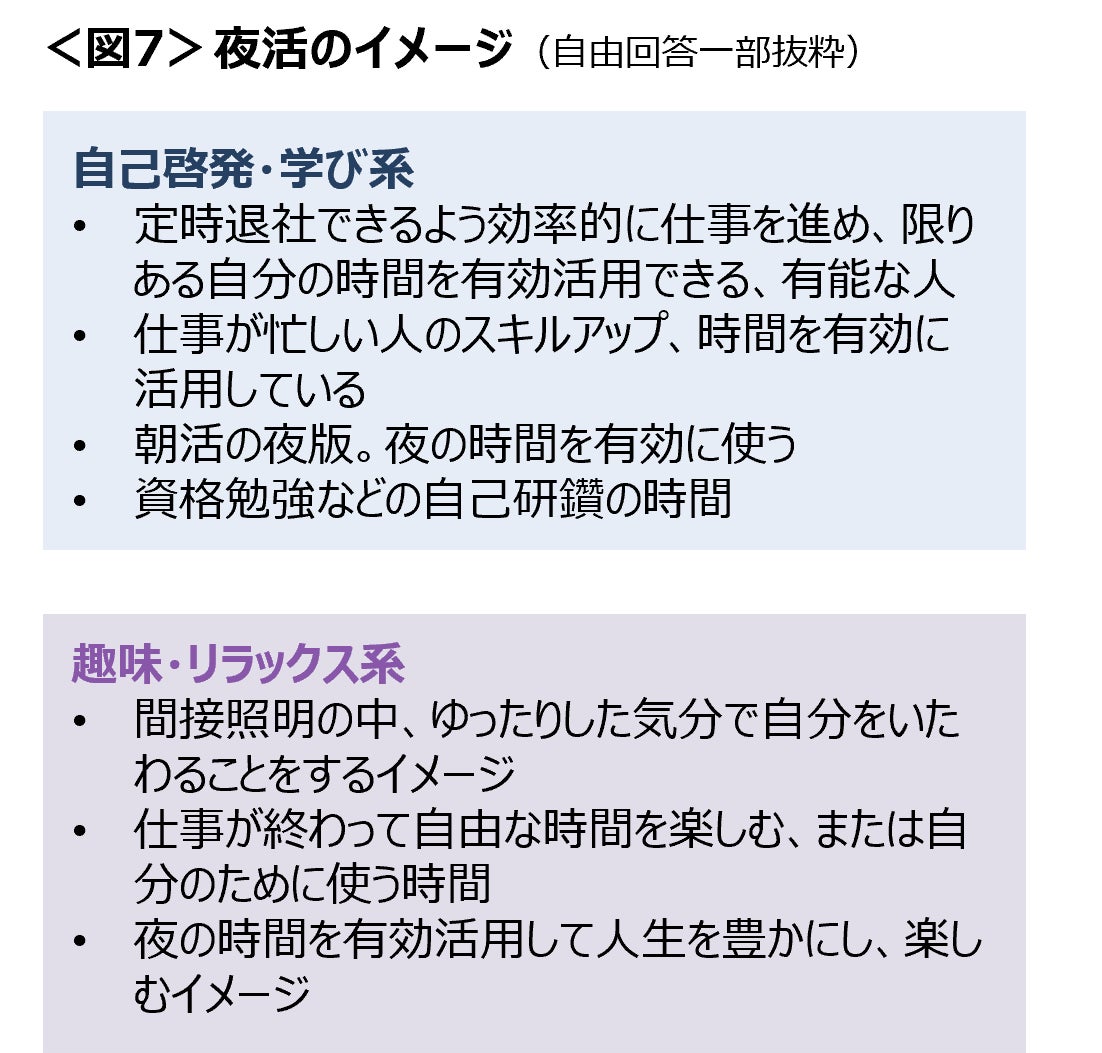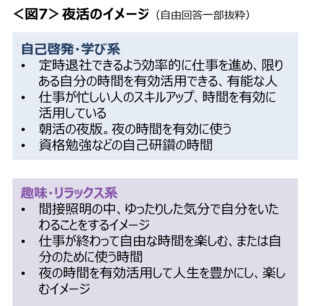 夜活のイメージでは、「自己研鑽の時間」「自分のための時間」といった回答があがる。 <図7>