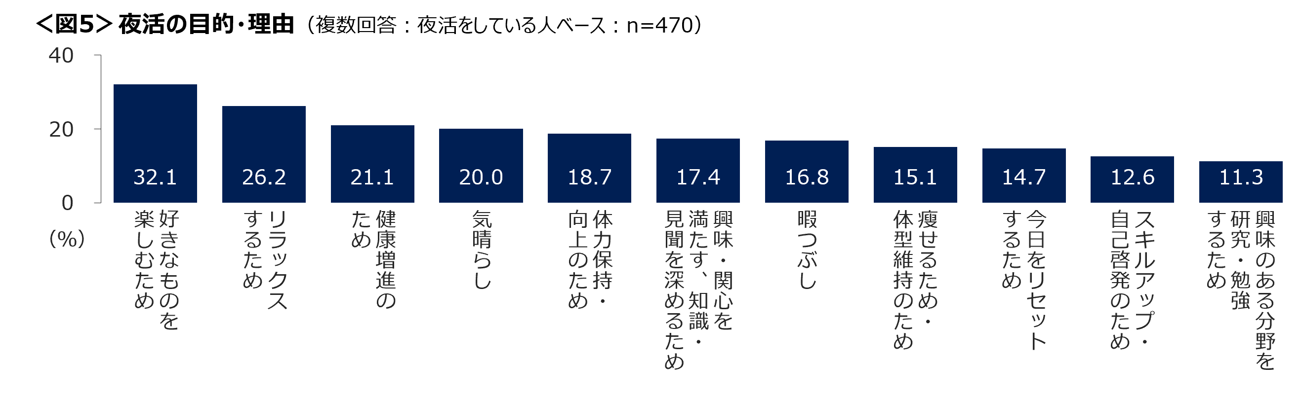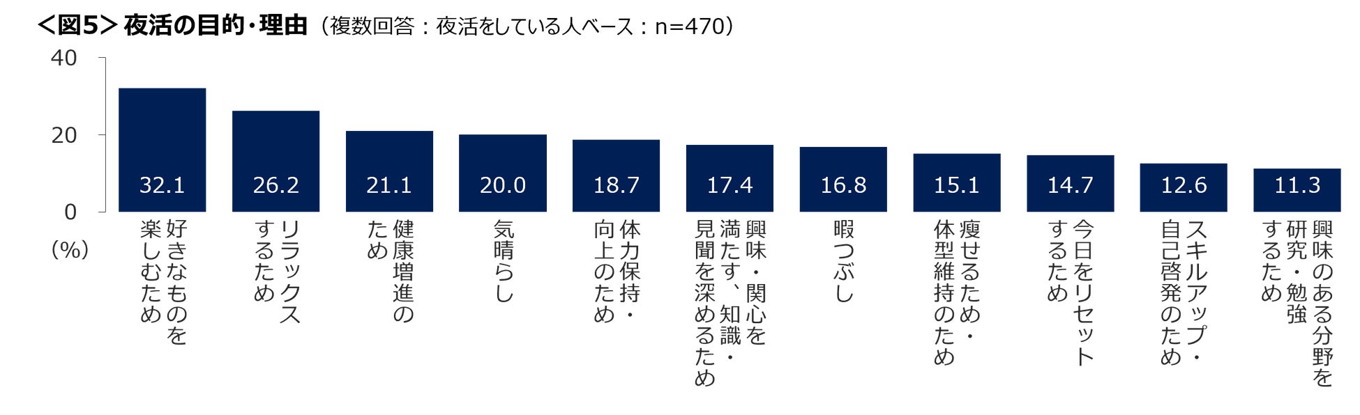 夜活の目的は「好きなものを楽しむため」がトップ。次いで、「リラックスするため」と続く。<図5>