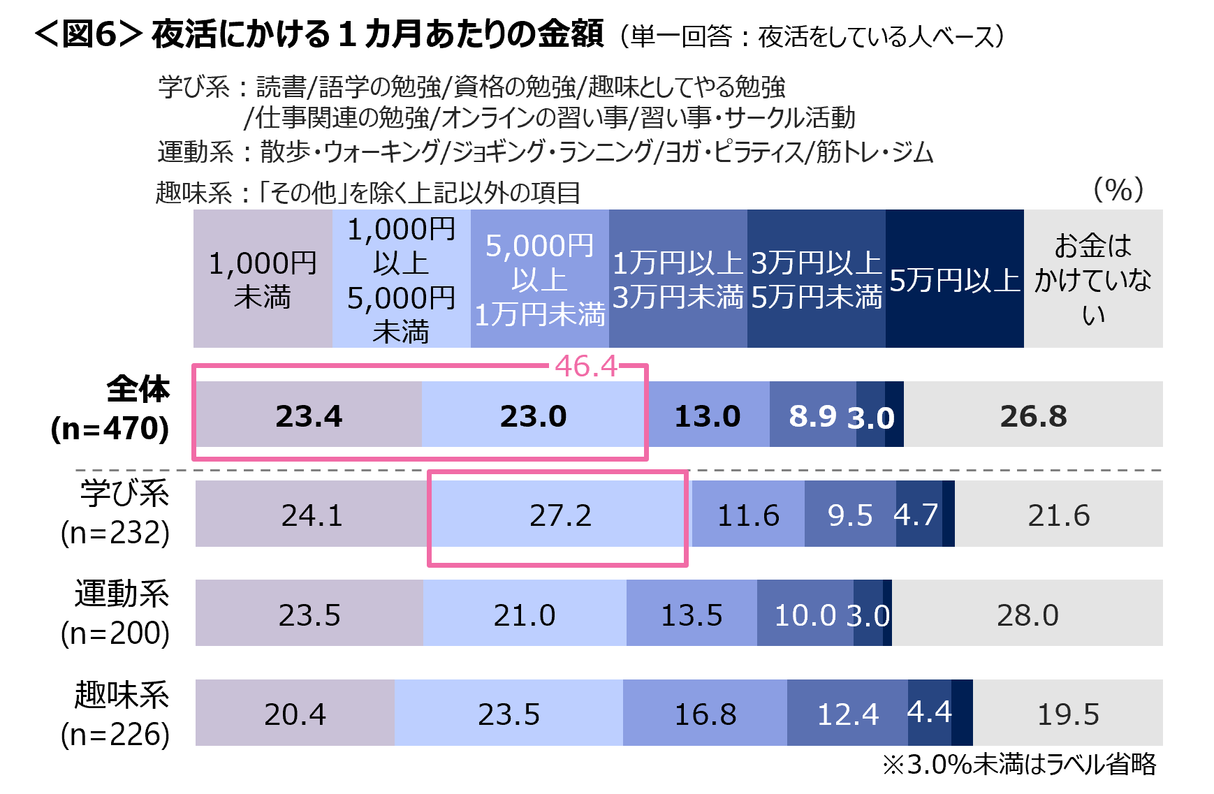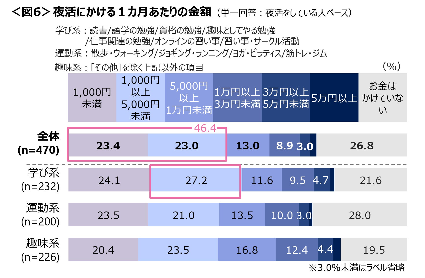 1ヵ月あたりの夜活にかけるお金は「5,000円未満」が46.4%と約半数。<図6>