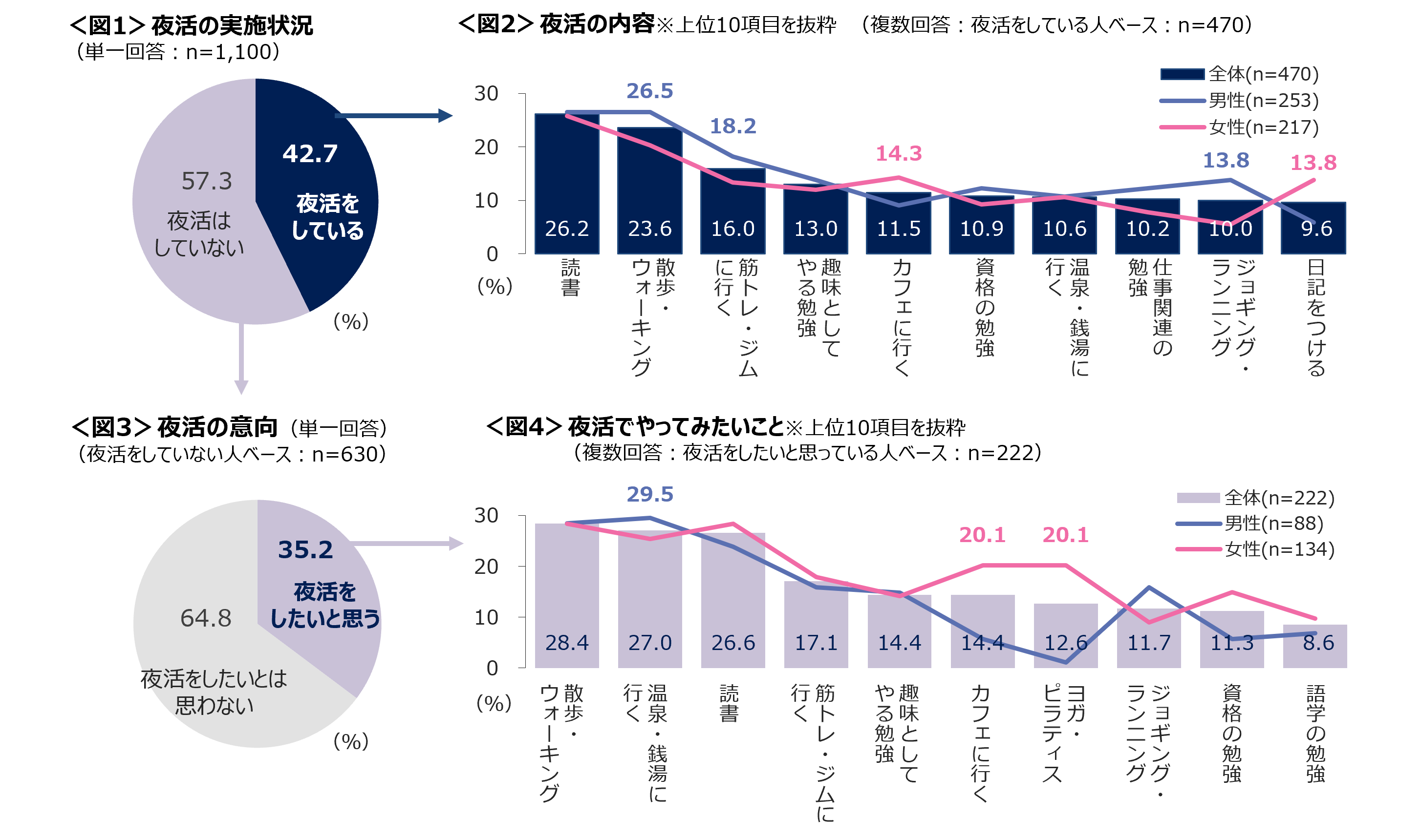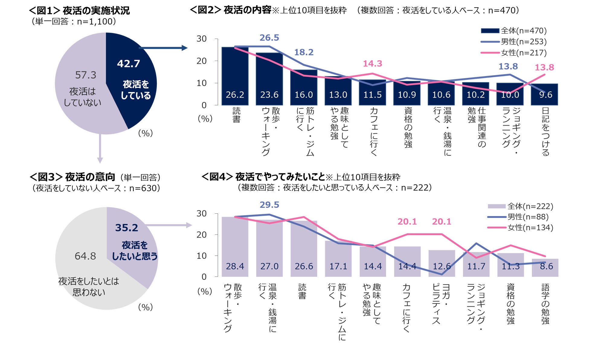 「夜活をしている」のは42.7%。「読書」「散歩・ウォーキング」「筋トレ・ジムに行く」が上位。<図1、2>