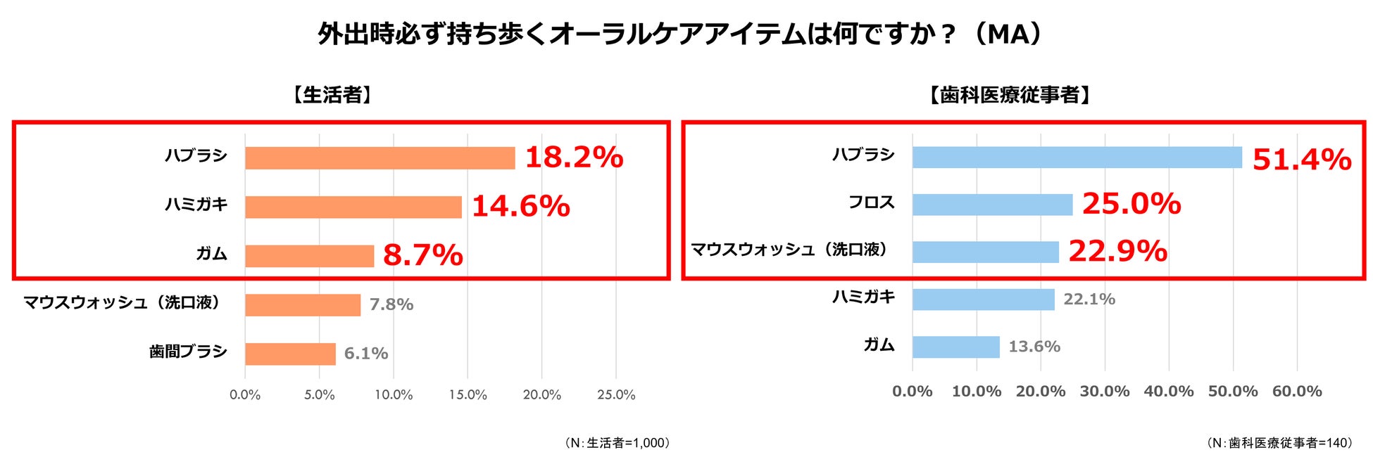 生活者が持ち歩くアイテムは、1位ハブラシ(18.2%)、2位ハミガキ(14.6%)、3位ガム(8.7%)が上位になりました。歯科医療従事者は1位ハブラシ(51.4%)、2位フロス(25.0%)、3位マウスウォッシュ(洗口液)(22.9 %)が上位となり、口腔ケア意識が生活者と比較して高いことが分かりました。