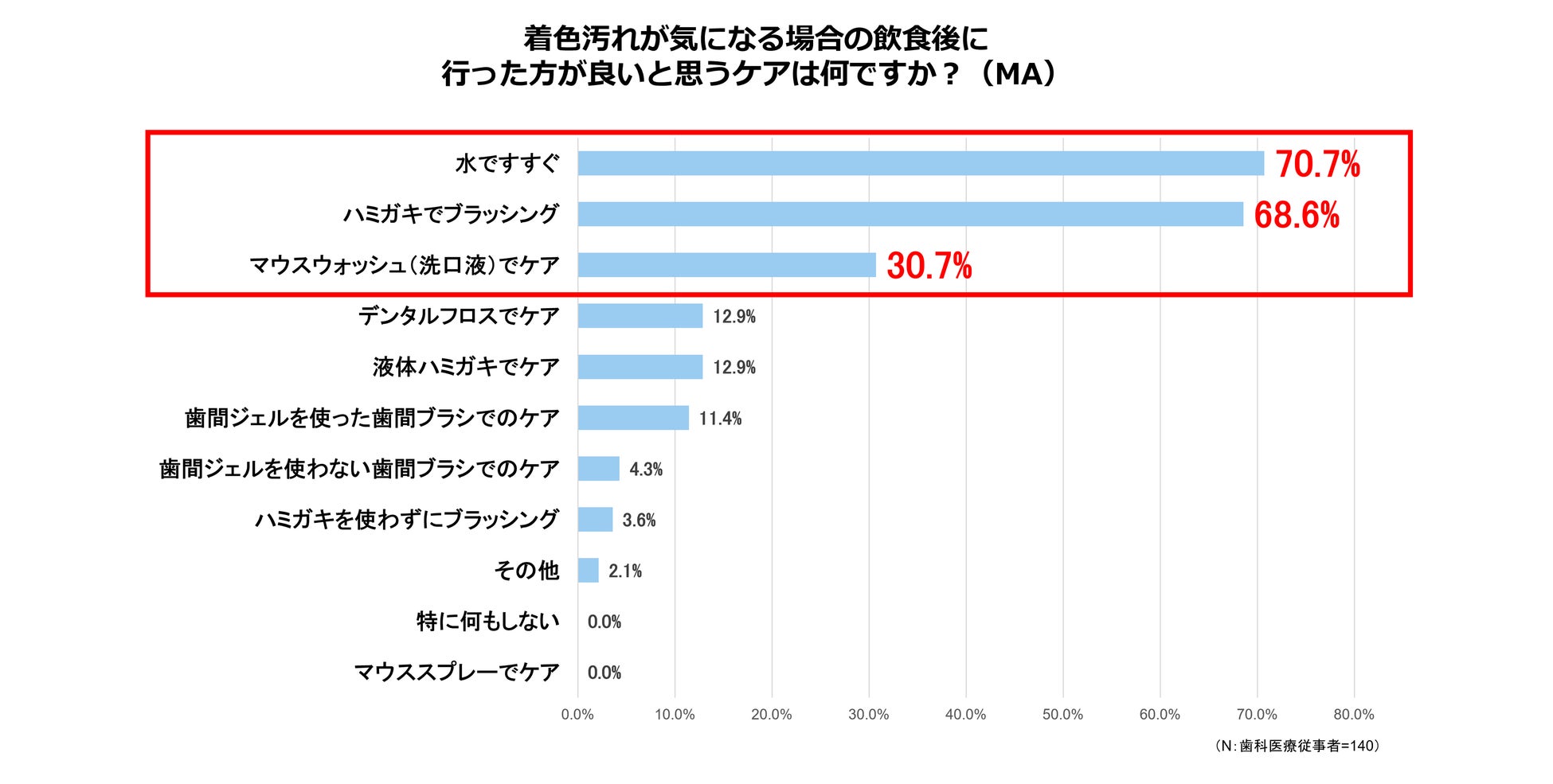歯科医療従事者向けに、着色汚れが気になる場合の行ったほうが良い飲食後のケアを質問したところ、1位:水ですすぐ(70.7%)、2位:ハミガキでブラッシング(68.6%)、3位:マウスウォッシュ(洗口液)でケア(30.7%)の順で回答が多い結果となりました。