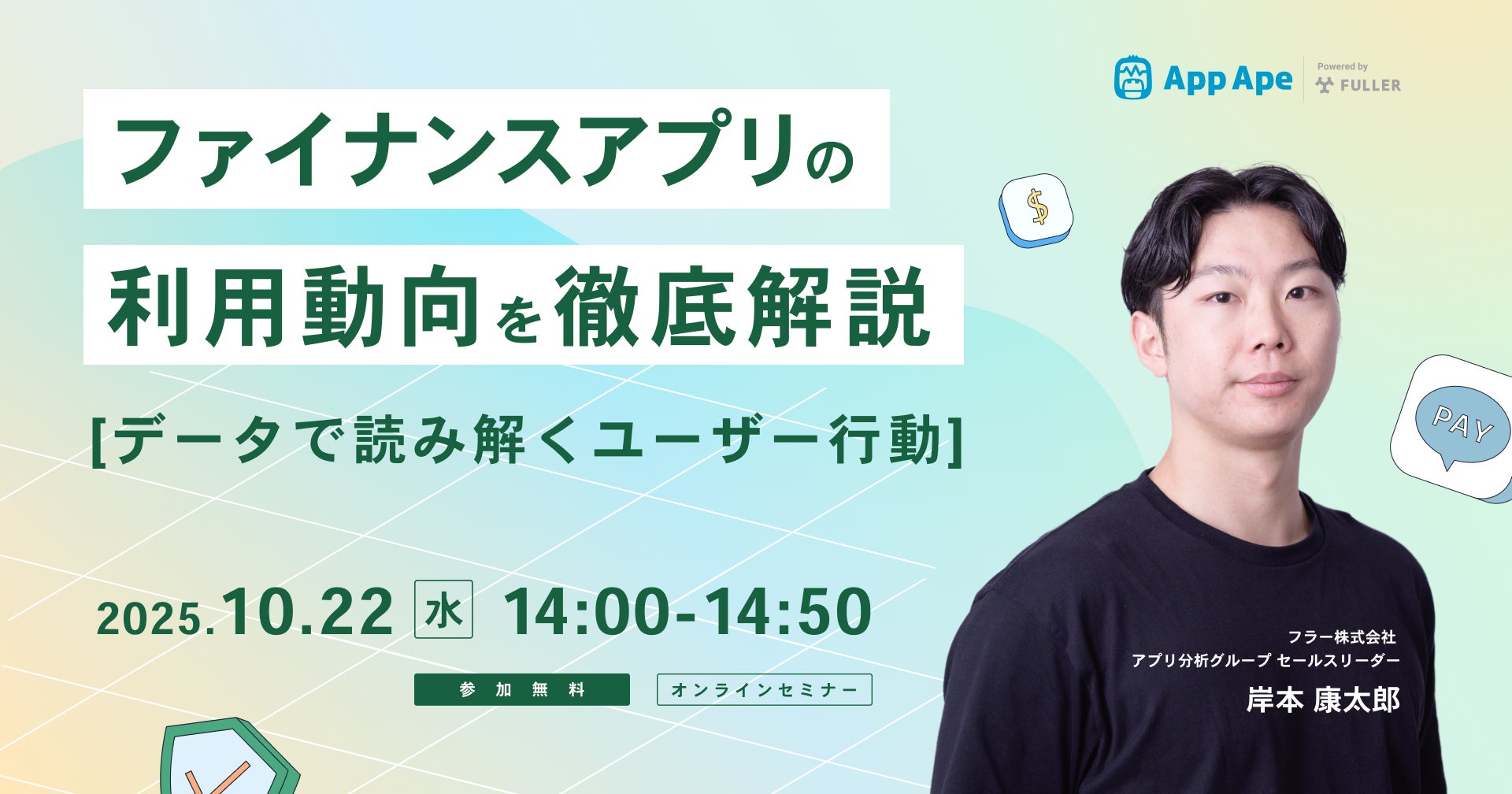 アプリ市場分析サービス「App Ape(アップ・エイプ)」を手がけるフラー株式会社(本社:新潟県新潟市、代表取締役社長:山﨑将司、以下「フラー」)は、ファイナンスアプリ市場の最新動向を解説するオンラインセミナー「ファイナンスアプリの利用動向を徹底解説 データで読み解くユーザー行動」を2025年10月22日(水)に開催します。