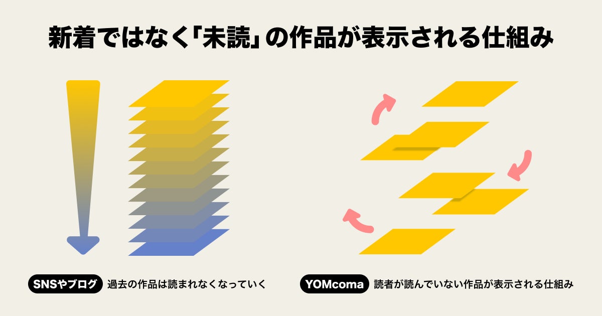 今後は、Xに限らず、ブログサービス、Instagram、TikTok、YouTubeなど、様々な場でショートマンガを見てもらいたいクリエイターの創作活動を支援するため、過去作品がずっと読まれ続けるプラットフォームとして価値提供を目指していきます。「YOMcoma」は、通常のSNSやブログと大きく異なり、マンガを新着順で表示するよりも、「その読者にとっての未読作品」を優先的に表示し続ける仕組みになっています。これにより、既存のSNSやアプリでは時間経過とともに読まれなくなってしまった「過去作品」が、「YOMcoma」の中では多くの読者にずっと読まれ続けることが可能になります。