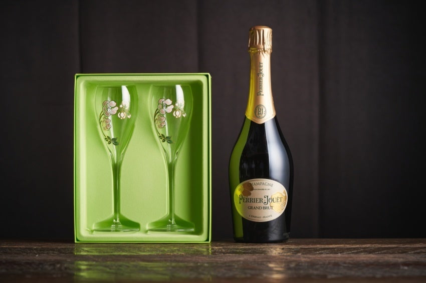 ペリエ ジュエ グラン ブリュットとシャンパーニュグラス2脚