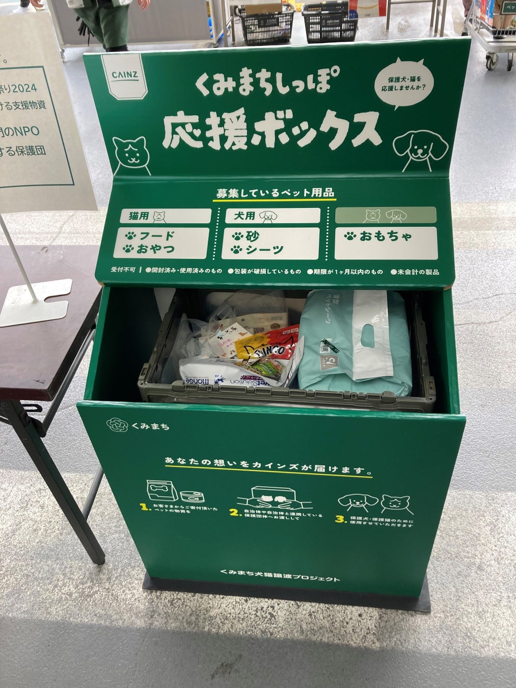 2024年11月9日(土)・10日(日)の2日間、カインズ 鶴ヶ島店にて開催された、わんちゃんとわんちゃんオーナーが一緒に楽しめるイベント「わんわん祭りinカインズ 鶴ヶ島店」にて、自治体と協力する保護団体への物資支援を目的とした「くみまちしっぽ応援ボックス」を設置したところ、未開封・未使用のペット用品やペットフードなどの物資を多くのお客様からお寄せいただきました。皆さまからお預かりしたご厚意は、NPO法人ねこネットワークを通じて、自治体と連携する保護犬団体へ支援品としてお届けしました。