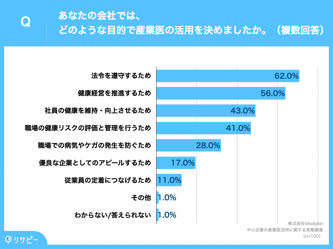 さらに、「あなたの会社では、どのような目的で産業医の活用を決めましたか」と質問したところ、「法令を遵守するため」が62.0%、「健康経営を推進するため」が56.0%、「社員の健康を維持・向上させるため」が43.0%という回答となりました。