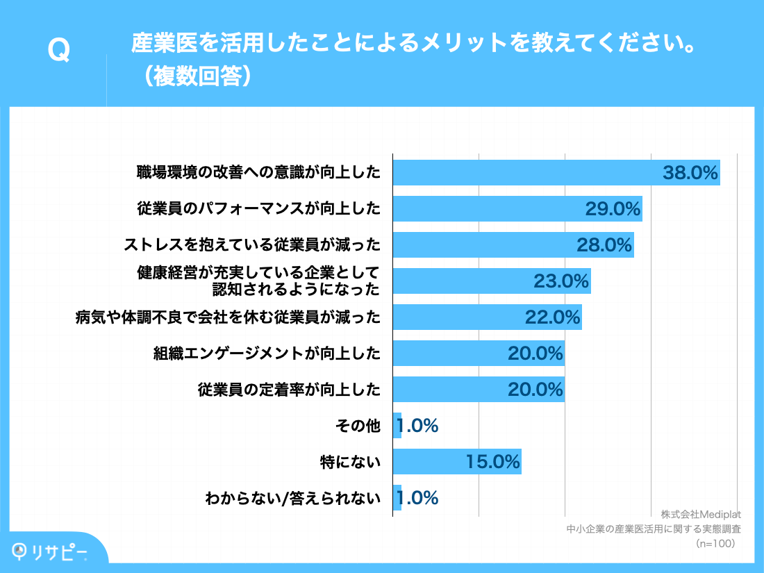 産業医活用のメリット、「職場環境の改善への意識が向上した」と約4割が回答「従業員のパフォーマンス向上」「ストレスを抱えている従業員が減った」も約3割に