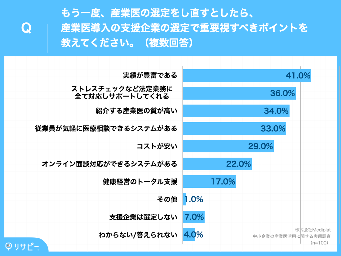 産業医導入の支援企業の選定で重要視すべきポイント、「実績が豊富である」が41.0%で最多