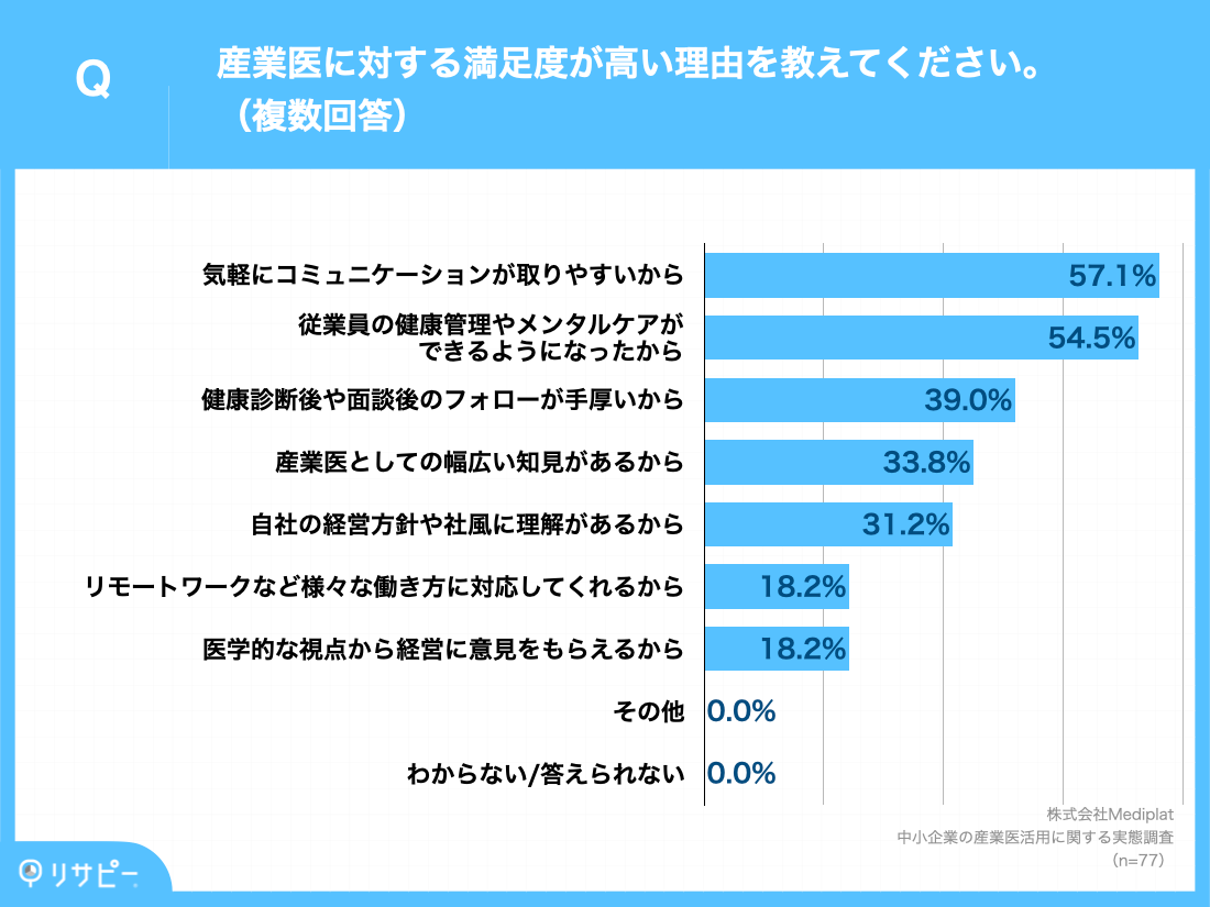 次に、「あなたの会社の産業医に対する満足度を教えてください。」との質問に「非常に高い」「やや高い」と回答した方に、「産業医に対する満足度が高い理由を教えてください。」と質問したところ、「気軽にコミュニケーションが取りやすいから」が57.1%、「従業員の健康管理やメンタルケアができるようになったから」が54.5%、「健康診断後や面談後のフォローが手厚いから」が39.0%となりました。
