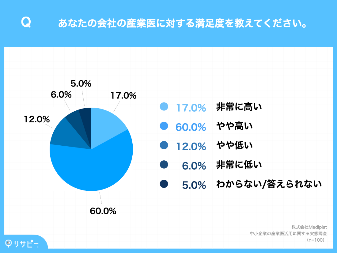 まず初めに、「あなたの会社の産業医に対する満足度を教えてください。」と質問したところ、「非常に高い」が17.0%、「やや高い」が60.0%と合わせて約8割の企業で産業医の満足度が高い結果となりました。
