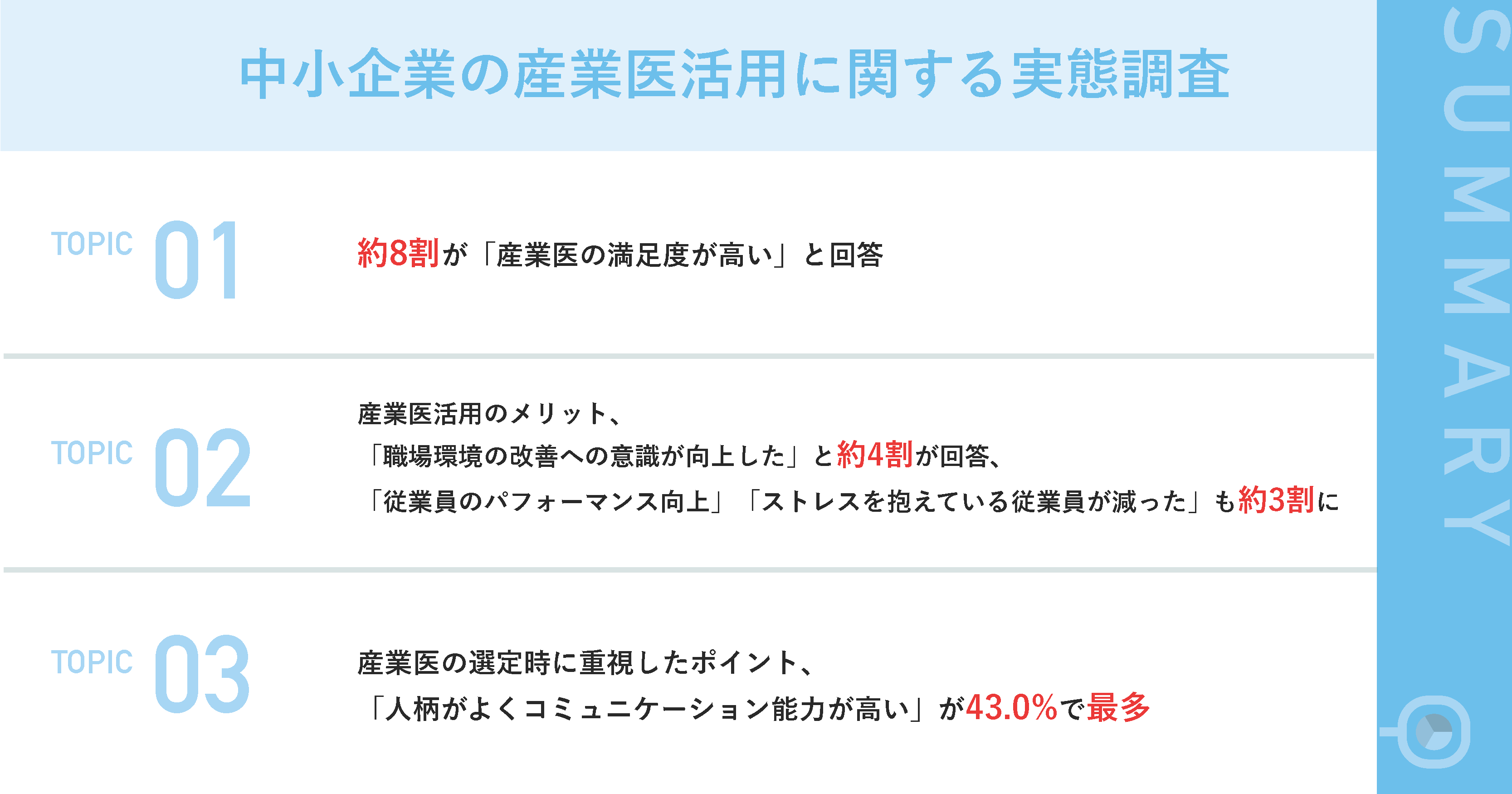 今回の調査では、産業医を活用している企業においては、法令を遵守すること以上に健康経営や社員の心身の健康維持が目的になっていることが分かっただけでなく、産業医を活用することで様々なメリットを実感していることが分かりました。また、職場環境だけでなく、従業員のパフォーマンス向上に繋がっているケースも少なくなく、満足度が高い結果が明らかになりました。