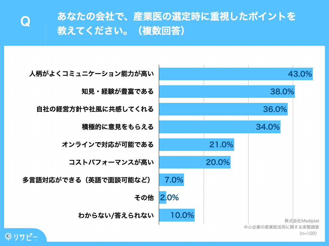 産業医の選定時に重視したポイント、「人柄がよくコミュニケーション能力が高い」が43.0%で最多
