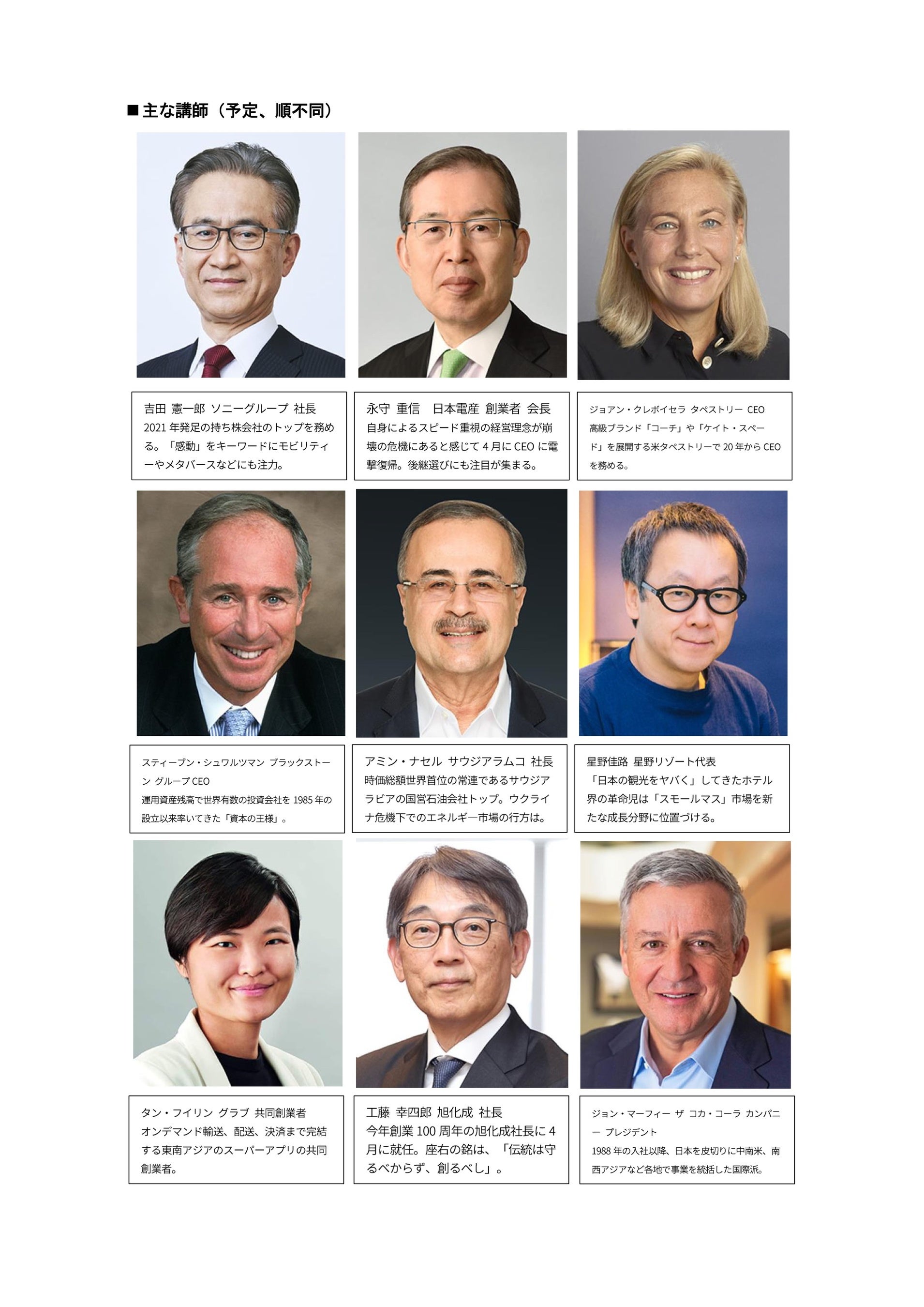 ソニーグループの吉田憲一郎社長をはじめ、日本電産の永守重信会長、星野リゾートの星野佳路代表、旭化成の工藤幸四郎社長ら今年も多種多様な業界のトップが登壇し、逆風をどのように好機ととらえ、どのような戦略を描いていくのか、熱い議論を交わします。