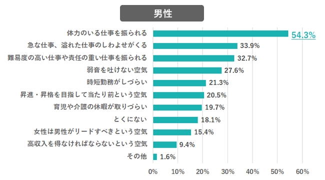 一方男性は、「体力のいる仕事を振られる」54.3%、「急な仕事、溢れた仕事のしわよせがくる」33.9%、「難易度の高い仕事や責任の重い仕事を振られる」32.7%が上位になっています。「とくにない」は女性とほぼ同じ18.1%で、男性も多くが職場でジェンダーによる偏りを感じていることがわかりました。