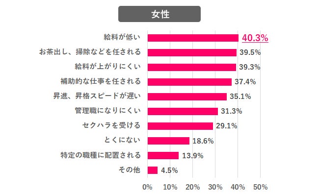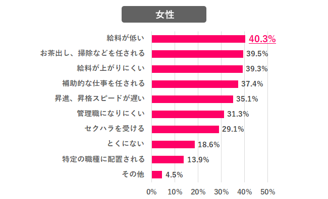 最も多かったのは「給料が低い」で40.3%、次いで「お茶出し、掃除などを任される」39.5%、「給料が上がりにくい」39.3%となりました。「とくにない」が18.6%あるものの、多数の女性が職場で格差を実感していることがわかります。